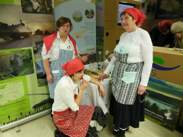 V svoji noši in s prisrčnim pristopom smo privabili veliko mimoidočih. Zanimalo jih je predvsem od kod prihajamo, saj smo skupaj ugotavljali, da imamo v Sloveniji več območij, ki se imenujejo Podgora, Podgura ali Pudgura. Predstavili smo jim našo dejavnost, kozolec in zbirko v njem in jih povabili, da nas obiščejo. Pri tem nam je bila v pomoč lani izdana zloženka. Postregli smo jih z doma pečenim kruhom, klobaso in panceto, ter s pudgursko slivovko in moštom. Čeprav smo bili v Pudguri in v Postojni takrat že dva dni brez elektrike in zaradi tega večina gospodinj, ki so obljubile domače pecivo ni mogla obljube uresničiti, smo našli še nekaj zaloge v zamrzovalnih skrinjah. Bolj revne skutne štruklje- kar smo pač našle doma- pa smo zamesile ob svečah in spekle v štedilniku na drva.