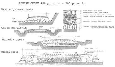 O rimskih cestnih povezavah izvemo v antičnih zemljevidih, od grških in rimskih geografov ter zgodovinarjev, iz epigrafskih spomenikov, miljnikov in arheološko ugotovljenih cestah ter naselbinah. Rimljani so postavljali ceste čim bolj naravnost. Gradili so jih prek močvirij in visokih prelazov, prek voda in jih celo vsekovali v živo skalo. Gradnje cest so se naučili od Etruščanov. Shemo rimske ceste je podal Vitruvius Pollio v svojem delu »De architectura«: